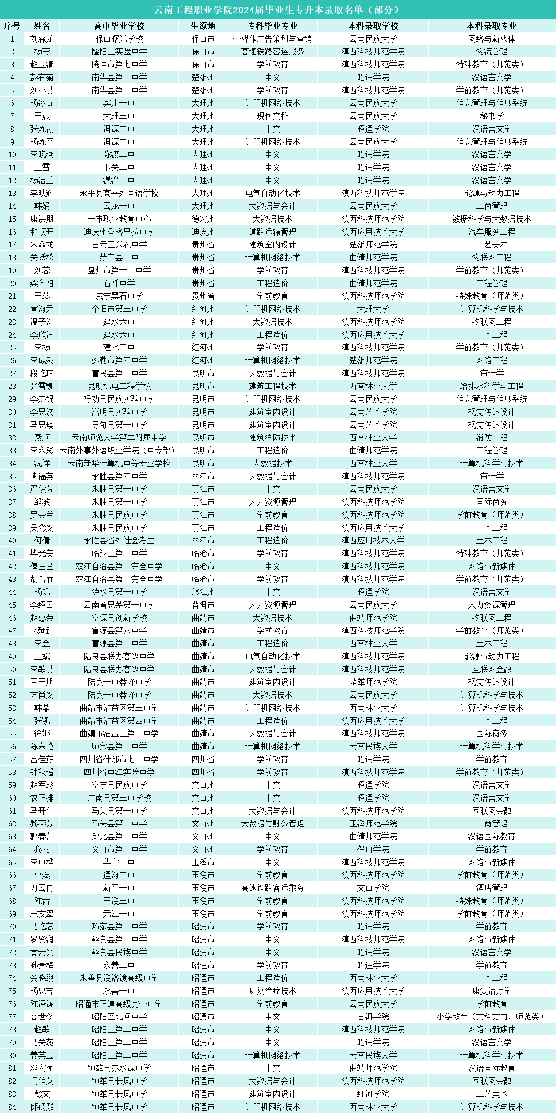 近日,云南省2024年专升本录取结果公布,云南工程职业学院2024届毕业生韩晶、沈祥、李金、郎碉雕等447名同学(其中优秀获奖免试2人,退役大学生士兵免试8人),分别被云南民族大学、西南林业大学、云南艺术学院等23所省内本科院校录取,学子们考入云工后,他们不负教诲与期待,在云工精进学业、升华思想、砥砺前行,书写青春乐章。学校高度重视专升本和学生综合素质发展工作,不断深化教学内涵和课堂教学改革,今年我校毕业生在专升本考试中再创佳绩,体现了学校坚持特色办学,狠抓内涵建设,提升人才培养质量所取得的良好成效。