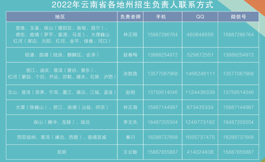 云南工程职业学院2022年云南省各地州招生负责人联系方式(三年制大专)