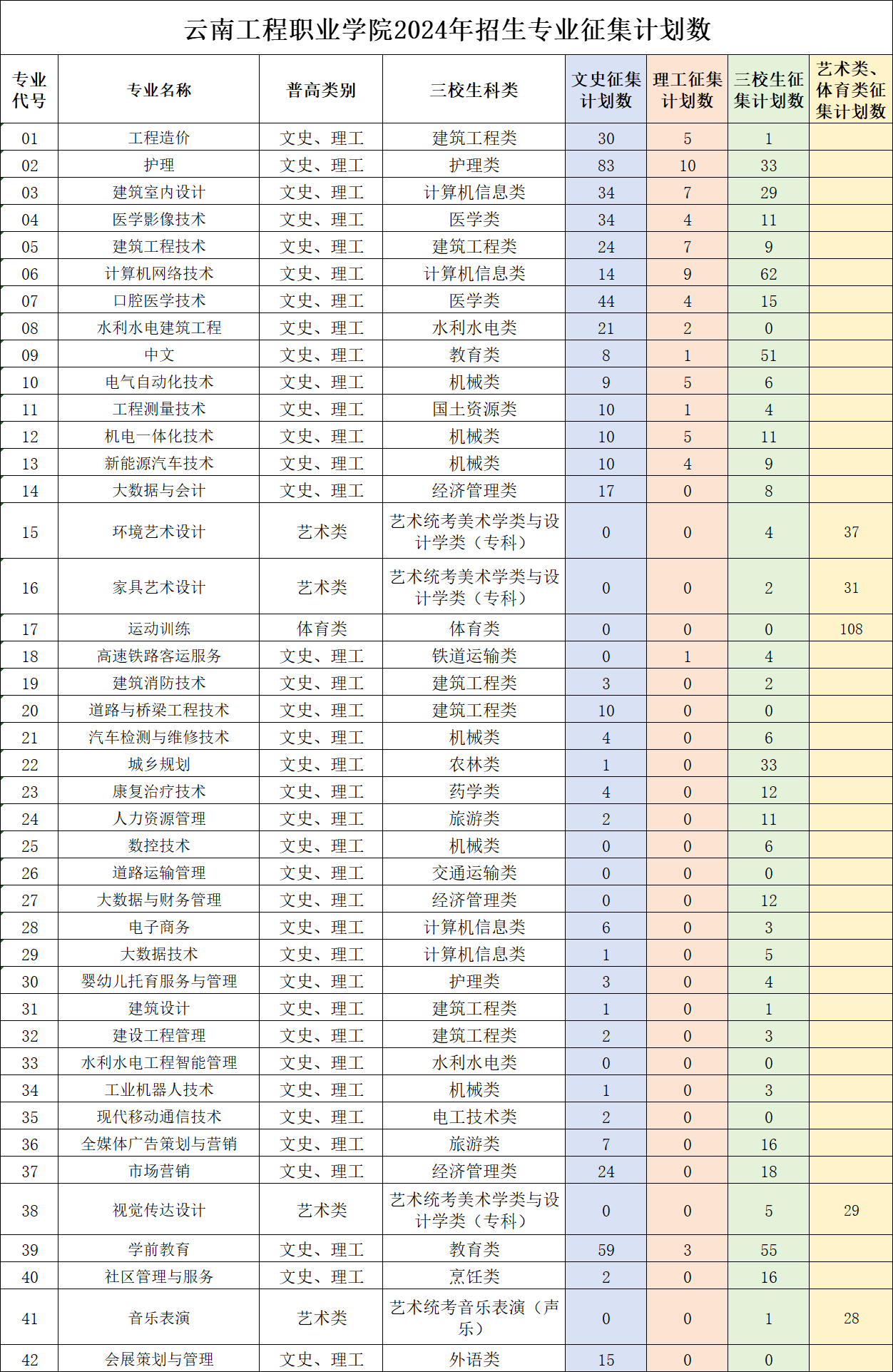 五、云南工程职业学院招生专业征集计划数