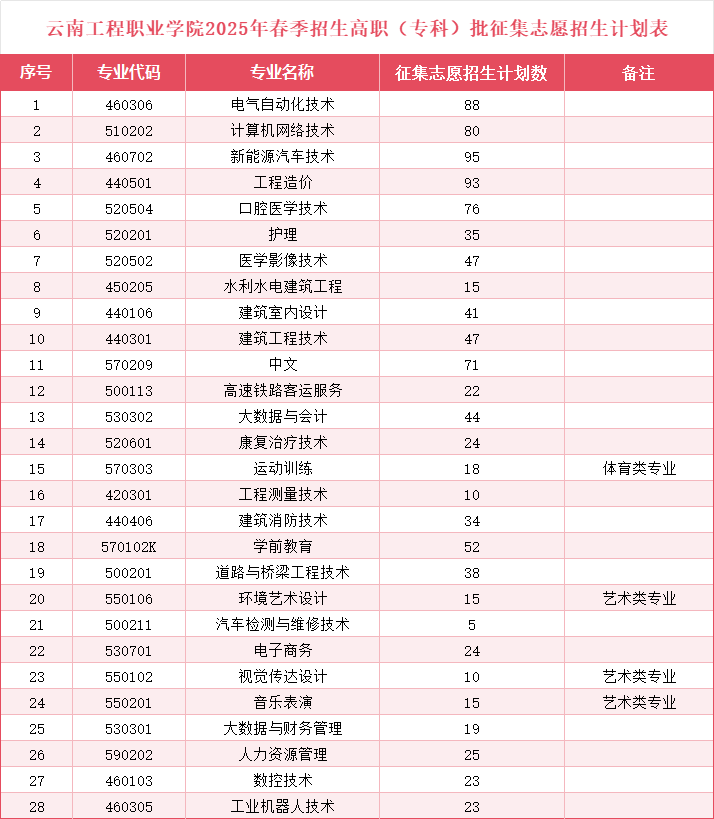 云南工程职业学院2025年春季招生高职(专科)批原始志愿考生于4月22日已录取结束,现学校部分专业尚有空余计划参加征集志愿,具体相关信息如下: