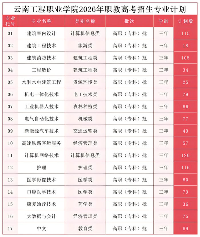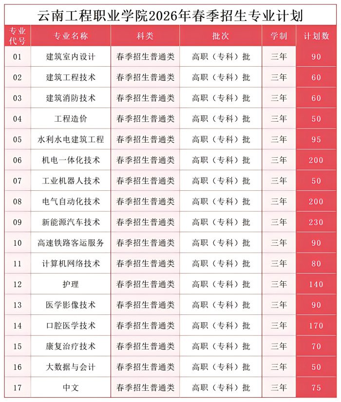 云南工程职业学院2026年春季招生及职教高考招生计划