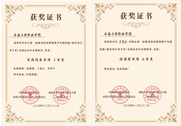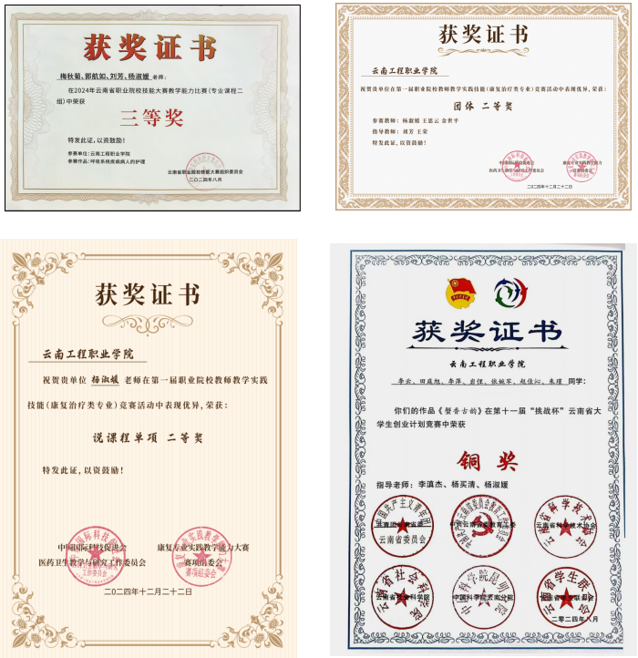 《康复评定技术》主讲教师杨淑媛和《运动治疗技术》主讲教师王思云曾在第一届全国职业院校教师教学实践技能(康复治疗类专业)比赛中荣获团体二等奖、实践技能二等奖和说课程二等奖、三等奖等奖励;刘芳、杨淑媛、梅秋菊、郭航如老师在2024年云南省职业院校技能大赛教学能力比赛中荣获三等奖;杨淑媛老师指导学生创新创业项目荣获省级铜奖。